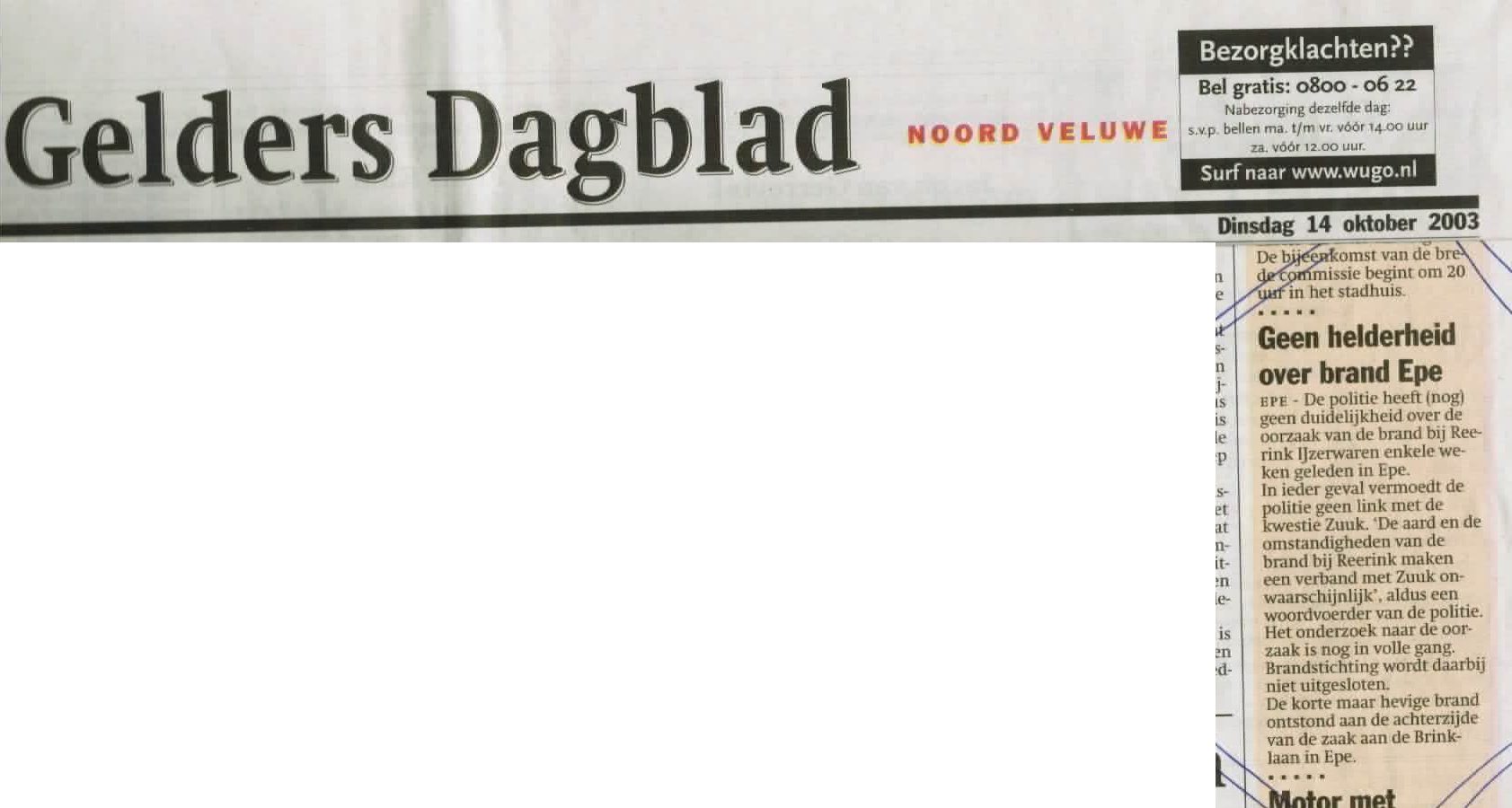 epe - De politie heeft (nog) geen duidelijkheid over de oorzaak van de brand bij Reerink IJzerwaren enkele weken geleden in Epe. In ieder geval vermoedt de politie geen link met de kwestie Zuuk. 'De aard en de omstandigheden van de brand bij Reerink maken een verband met Zuuk onwaarschijnlijk', aldus een woordvoerder van de politie. Het onderzoek naar de oorzaak is nog in volle gang. Brandstichting wordt daarbij niet uitgesloten. De korte maar hevige brand ontstond aan de achterzijde van de zaak aan de Brink-laan in Epe.